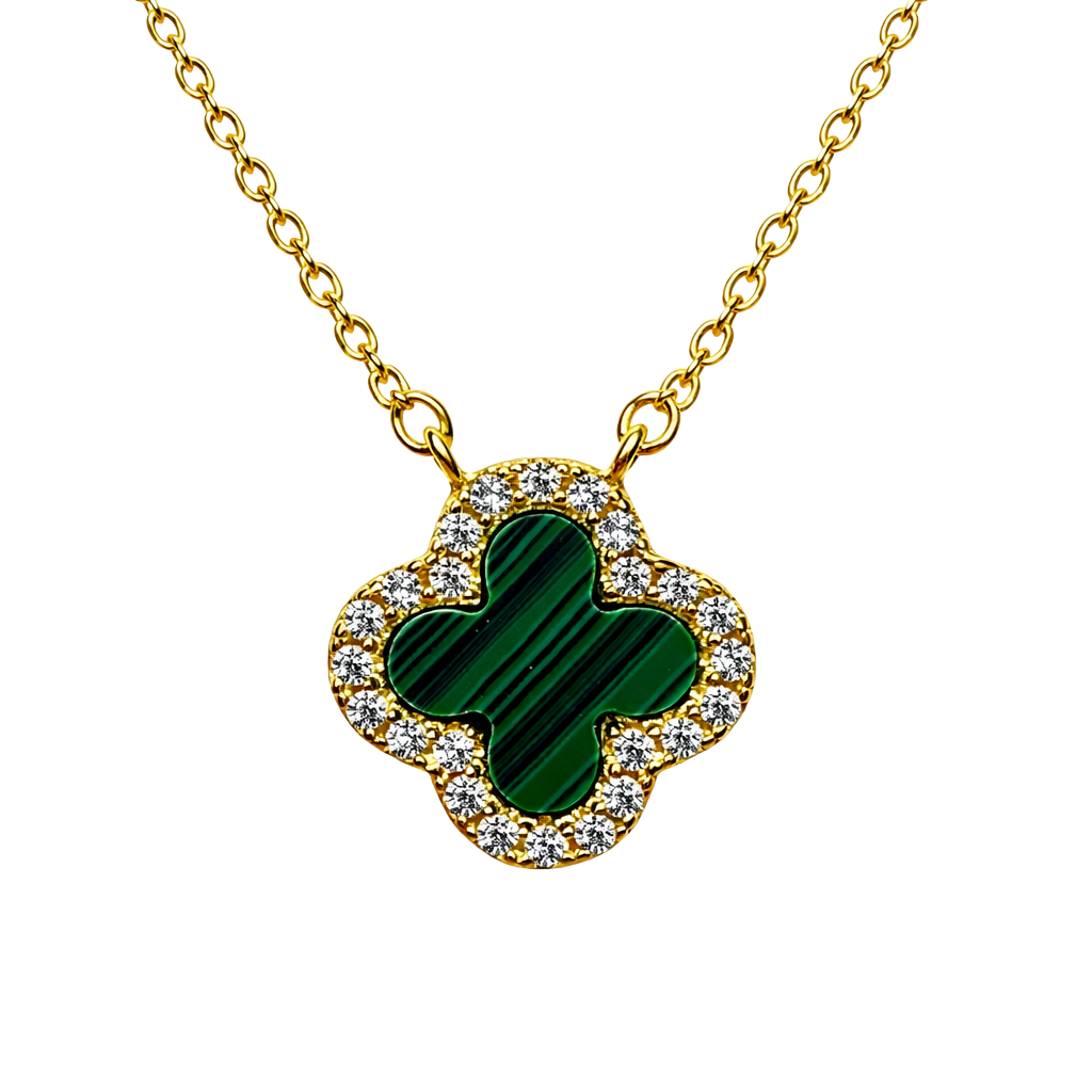 The pendant is surrounded by brilliant zircon stones for maximum sparkle and features two luxurious center options: a deep green clover stone and a luminous white clover finish. The combination of sterling silver, gold plating, and zircon creates a high-end look perfect for everyday wear or special occasions.